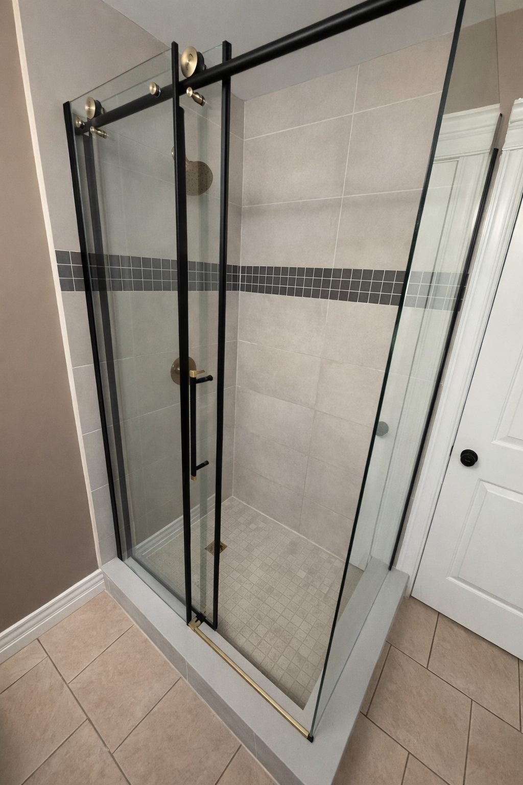 A modern glass shower door completed the project.